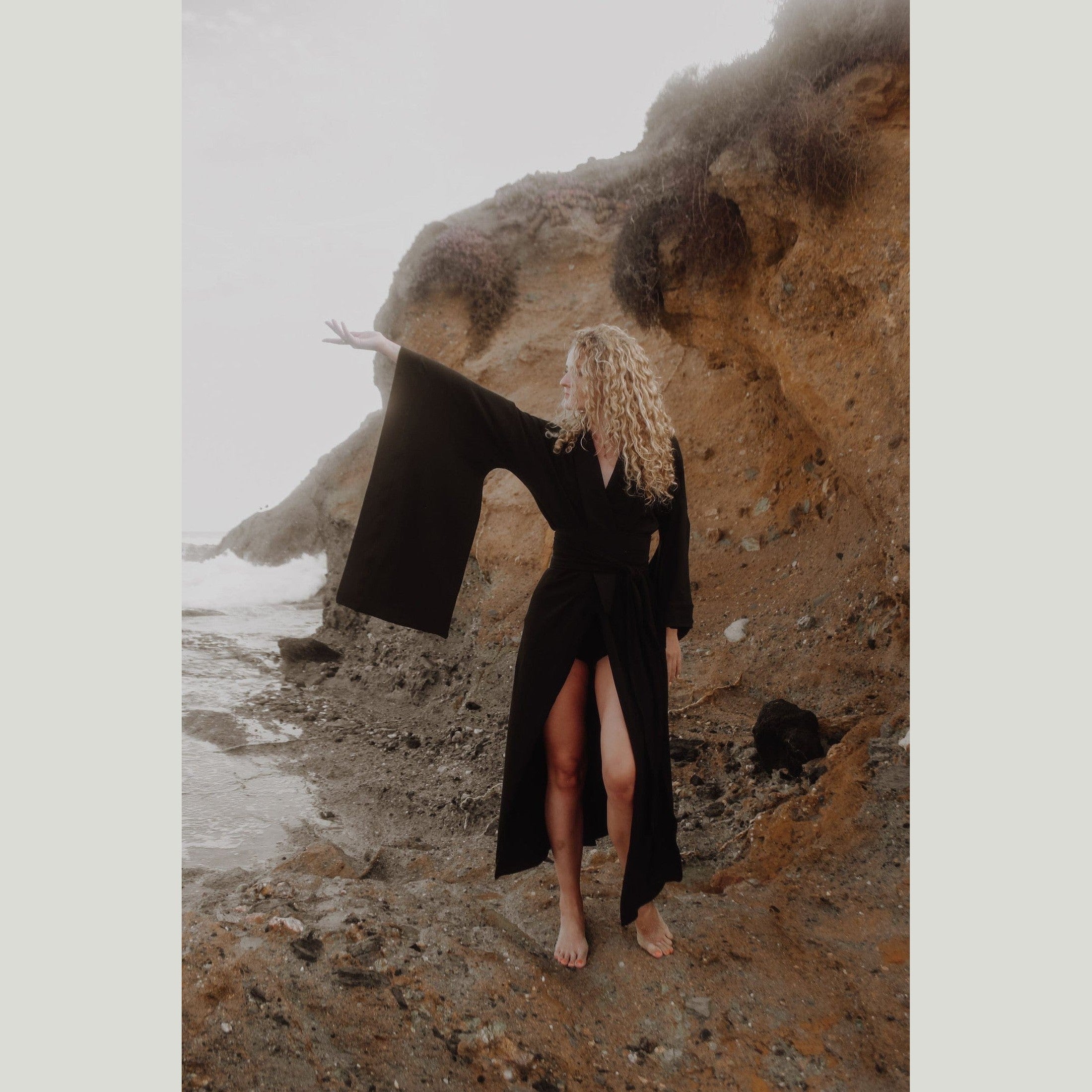 Inspired by traditional Japanese silhouettes and crafted with a modern, ethical ethos, the Air Nomad Black Kimono by Glorka blends quiet luxury with everyday comfort. This made-to-order piece is constructed from a soft yet structured cotton blend, offering a beautifully weighted drape that moves with grace.